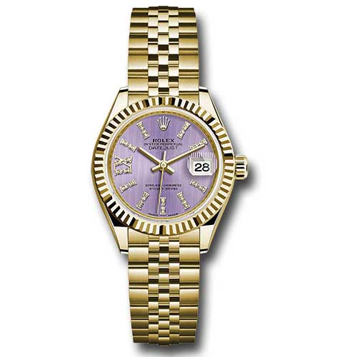 Rolex 279178 lils36dix8dj Ladies Watch. This luxurious watch features a 28mm 18K yellow gold Oyster case equipped with a screw-down crown that utilizes the Twinlock double waterproofness system and a classic fluted bezel. It boasts a scratch-resistant sapphire crystal with a cyclops lens over the date and a double anti-reflective coating, showcasing a striking cornflower lilac stripe dial adorned with 9 diamonds set in index hour markers and eight diamonds at the Roman numeral IX. Powered by the Rolex calibre 2236 automatic movement, it includes center hour, minute, and seconds hands along with an instantaneous date feature that allows for rapid setting and stop-seconds for precise time adjustment. The elegant 18K yellow gold Jubilee bracelet, featuring five-piece links and a concealed folding Crownclasp buckle, reinforces its sophisticated design, while the watch is waterproof up to 100 meters.
