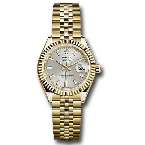 Rolex 279178 sij Ladies Watch. This luxurious watch features a 28mm 18K yellow gold Oyster case equipped with a screw-down crown that utilizes the Twinlock double waterproofness system and a classic fluted bezel. It boasts a scratch-resistant sapphire crystal with a cyclops lens over the date and a double anti-reflective coating, showcasing a striking cornflower silver dial adorned with index hour markers. Powered by the Rolex calibre 2236 automatic movement, it includes center hour, minute, and seconds hands along with an instantaneous date feature that allows for rapid setting and stop-seconds for precise time adjustment. The elegant 18K yellow gold Jubilee bracelet, featuring five-piece links and a concealed folding Crownclasp buckle, reinforces its sophisticated design, while the watch is waterproof up to 100 meters.
