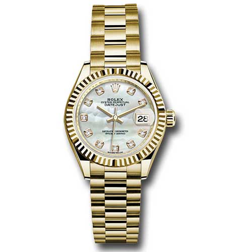 Rolex 279178 mdp Ladies Watch. This exquisite watch features a 28mm 18K yellow gold Oyster case with a screw-down crown that incorporates the Twinlock double waterproofness system and a classic fluted bezel. It boasts a scratch-resistant sapphire crystal enhanced by a cyclops lens over the date and a double anti-reflective coating, showcasing a stunning mother of pearl dial adorned with diamond hour markers, Powered by the Rolex calibre 2236 automatic movement, it includes center hour, minute, and seconds hands, instantaneous date with rapid setting, and stop-seconds for precise time adjustment. The elegant 18K yellow gold President bracelet features semi-circular three-piece links and is secured with a concealed folding Crownclasp buckle, all while being waterproof up to 100 meters.