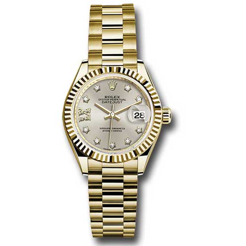 Rolex 279178 s9dix8dp Ladies Watch. This exquisite watch features a 28mm 18K yellow gold Oyster case with a screw-down crown that incorporates the Twinlock double waterproofness system and a classic fluted bezel. It boasts a scratch-resistant sapphire crystal enhanced by a cyclops lens over the date and a double anti-reflective coating, showcasing a stunning silver dial adorned with 9 diamonds hour markers and eight diamonds at the Roman numeral IX. Powered by the Rolex calibre 2236 automatic movement, it includes center hour, minute, and seconds hands, instantaneous date with rapid setting, and stop-seconds for precise time adjustment. The elegant 18K yellow gold President bracelet features semi-circular three-piece links and is secured with a concealed folding Crownclasp buckle, all while being waterproof up to 100 meters.