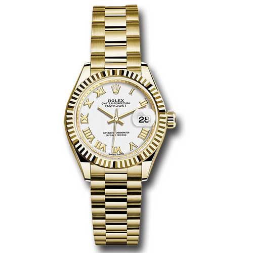 Rolex 279178 wrp Ladies Watch. This exquisite watch features a 28mm 18K yellow gold Oyster case with a screw-down crown that incorporates the Twinlock double waterproofness system and a classic fluted bezel. It boasts a scratch-resistant sapphire crystal enhanced by a cyclops lens over the date and a double anti-reflective coating, showcasing a stunning white dial adorned with Roman numerals, Powered by the Rolex calibre 2236 automatic movement, it includes center hour, minute, and seconds hands, instantaneous date with rapid setting, and stop-seconds for precise time adjustment. The elegant 18K yellow gold President bracelet features semi-circular three-piece links and is secured with a concealed folding Crownclasp buckle, all while being waterproof up to 100 meters.