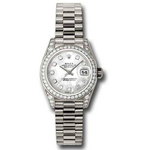 Rolex 179159 mdp Perpetual Lady-Datejust Watch. The Lady-Datejust 26 with a 42 Diamond Bezel is a breathtaking timepiece that combines luxury with sophisticated design. This stunning watch features a 26mm case crafted from 18K white gold, radiating elegance and refinement. The case lugs are enhanced with 24 diamonds, perfectly complementing the exquisite bezel, which is set with 42 brilliant diamonds that catch the light with every movement. The striking mother of pearl dial offers a dramatic contrast and is adorned with diamond hour markers, adding to its opulent appeal. Paired with the iconic President bracelet, also made of 18K white gold, this watch provides exceptional comfort and style. The Lady-Datejust 26 not only serves as a reliable timekeeping instrument but also as a magnificent statement piece, reflecting the exceptional craftsmanship that Rolex is renowned for.