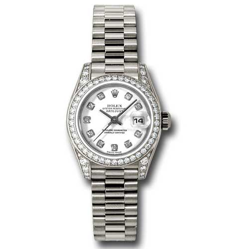 Rolex 179159 wdp Perpetual Lady-Datejust Watch. The Lady-Datejust 26 with a 42 Diamond Bezel is a breathtaking timepiece that combines luxury with sophisticated design. This stunning watch features a 26mm case crafted from 18K white gold, radiating elegance and refinement. The case lugs are enhanced with 24 diamonds, perfectly complementing the exquisite bezel, which is set with 42 brilliant diamonds that catch the light with every movement. The striking white dial offers a dramatic contrast and is adorned with diamond hour markers, adding to its opulent appeal. Paired with the iconic President bracelet, also made of 18K white gold, this watch provides exceptional comfort and style. The Lady-Datejust 26 not only serves as a reliable timekeeping instrument but also as a magnificent statement piece, reflecting the exceptional craftsmanship that Rolex is renowned for.