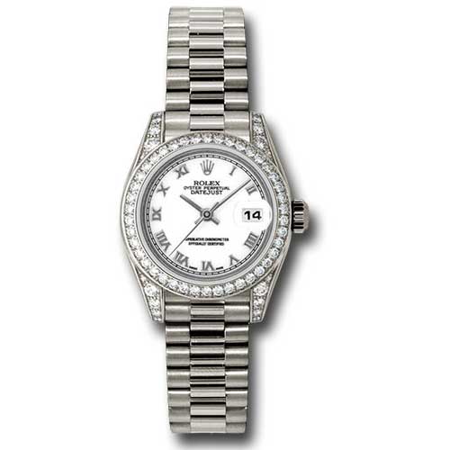 Rolex 179159 wrp Perpetual Lady-Datejust Watch. The Lady-Datejust 26 with a 42 Diamond Bezel is a breathtaking timepiece that combines luxury with sophisticated design. This stunning watch features a 26mm case crafted from 18K white gold, radiating elegance and refinement. The case lugs are enhanced with 24 diamonds, perfectly complementing the exquisite bezel, which is set with 42 brilliant diamonds that catch the light with every movement. The striking white dial offers a dramatic contrast and is adorned with Roman numerals, adding to its opulent appeal. Paired with the iconic President bracelet, also made of 18K white gold, this watch provides exceptional comfort and style. The Lady-Datejust 26 not only serves as a reliable timekeeping instrument but also as a magnificent statement piece, reflecting the exceptional craftsmanship that Rolex is renowned for.