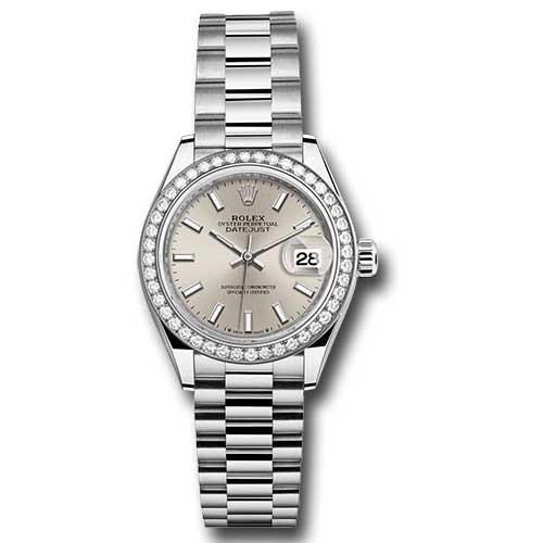 Rolex 279139rbr sip Lady-Datejust 28mm 18K white gold case, screw-down back, screw-down crown with twinlock double waterproofness system, bezel set with 44 brilliant-cut diamonds, scratch-resistant sapphire crystal with cyclops lens over the date, silver dial, index hour markers, Rolex calibre 2236 perpetual self-winding movement with centre hour, minute and seconds hands, instantaneous date with rapid setting, and stop-seconds for precise time setting, approximately 55 hours of power reserve, President bracelet with semi-circular three-piece links, concealed folding Crownclasp buckle.