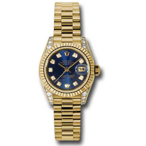 The Rolex 179238 bldp Oyster Perpetual Lady-Datejust is a stunning embodiment of elegance and luxury. This exquisite watch features a 26mm case crafted from 18K yellow gold, accentuated by case lugs set with 24 sparkling diamonds, which add a touch of opulence to its overall appearance. The iconic fluted bezel frames a rich blue dial adorned with diamond hour markers, providing a classic yet refined look. The watch is complemented by the prestigious President bracelet, also made of 18K yellow gold, ensuring both comfort and style. This Lady-Datejust is not only a reliable timepiece but also a remarkable statement piece perfect for any formal or casual occasion, showcasing the legendary craftsmanship that Rolex is known for.