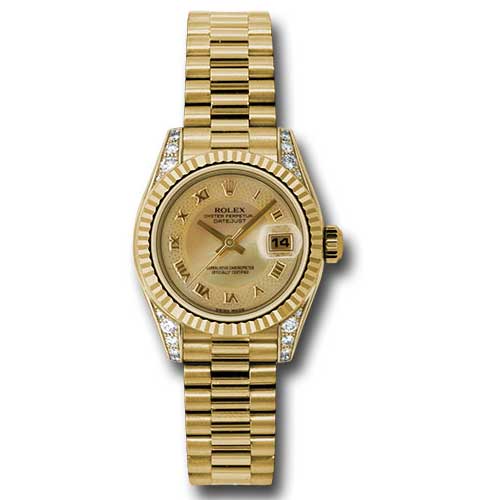 The Rolex 179238 chjdp Oyster Perpetual Lady-Datejust The Rolex Yellow Gold Lady-Datejust 26 is a stunning embodiment of elegance and luxury. This exquisite watch features a 26mm case crafted from 18K yellow gold, accentuated by case lugs set with 24 sparkling diamonds, which add a touch of opulence to its overall appearance. The iconic fluted bezel frames a rich champagne mother of pearl dial adorned with Roman numerals, providing a classic yet refined look. The watch is complemented by the prestigious President bracelet, also made of 18K yellow gold, ensuring both comfort and style. This Lady-Datejust is not only a reliable timepiece but also a remarkable statement piece perfect for any formal or casual occasion, showcasing the legendary craftsmanship that Rolex is known for.