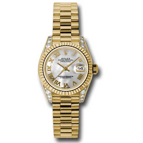 The Rolex 179238 mrp Oyster Perpetual Lady-Datejust is a stunning embodiment of elegance and luxury. This exquisite watch features a 26mm case crafted from 18K yellow gold, accentuated by case lugs set with 24 sparkling diamonds, which add a touch of opulence to its overall appearance. The iconic fluted bezel frames a rich mother-of-pearl dial adorned with Roman numerals, providing a classic yet refined look. The watch is complemented by the prestigious President bracelet, also made of 18K yellow gold, ensuring both comfort and style. This Lady-Datejust is not only a reliable timepiece but also a remarkable statement piece perfect for any formal or casual occasion, showcasing the legendary craftsmanship that Rolex is known for.