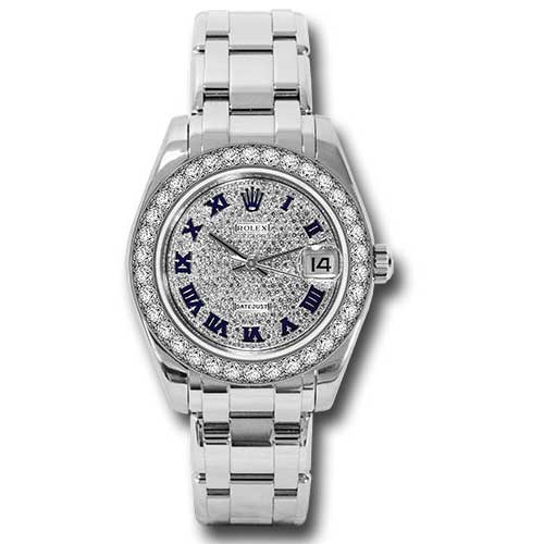 Rolex 81299 dpr Oyster Perpetual Datejust Pearlmaster Ladies Watch. 34mm 18K white gold case, screw-down crown, bezel set with 34 diamonds, scratch-resistant sapphire crystal with cyclops lens over the date, diamond paved dial, Roman numerals with 11 diamonds set on VI , Rolex calibre 2235 automatic movement, 18K white gold Pearlmaster bracelet with rounded five-piece links, concealed folding Crownclasp buckle. Water resistant to 100 meters.