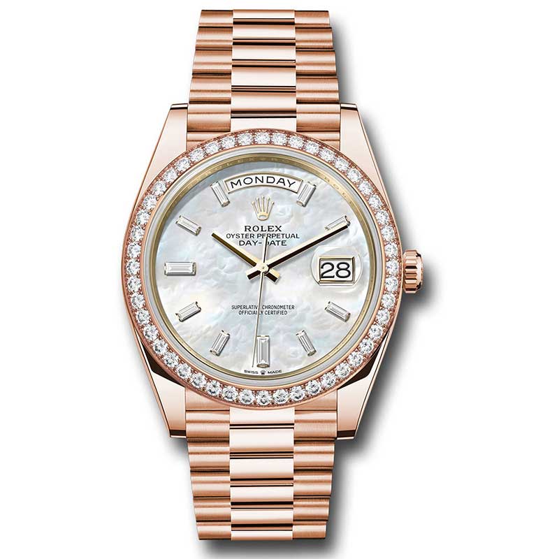 Rolex 228345rbr mbdp Oyster Perpetual Day-Date 40 Watch. 40mm 18K Everose gold case, screw-down back with Rolex fluting, screw-down crown with twinlock double waterproofness system, Everose gold bezel set with 48 diamonds, scratch-resistant double anti-reflective sapphire crystal with cyclops lens over the date, mother-of-pearl dial, 10 baguette-cut diamond hour markers, Rolex calibre 3255 automatic movement with centre hour, minute and seconds hands, instantaneous day and date in apertures, unrestricted rapid-setting, and stop-seconds for precise time setting, approximately 70 hours of power reserve, President bracelet with three-piece solid links comprised of a polished center link, satin-finished outer links, and ceramic inserts, concealed folding Crownclasp buckle. Waterproof to 100 meters.