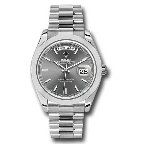 Rolex 228206 slip Oyster Perpetual Day-Date Men's Watch. 40mm 950 platinum case, screw-down back with Rolex fluting, screw-down crown with twinlock double waterproofness system, smooth bezel, scratch-resistant double anti-reflective sapphire crystal with cyclops lens over the date, slate dial, index hour markers, Rolex calibre 3255 automatic movement with centre hour, minute and seconds hands, instantaneous day and date in apertures, unrestricted rapid-setting, and stop-seconds for precise time setting, approximately 70 hours of power reserve, President bracelet with three-piece solid links comprised of a polished center link, satin-finished outer links, and ceramic inserts, concealed folding Crownclasp buckle. Waterproof to 100 meters.
