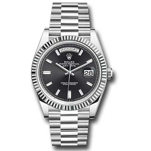 Rolex 228236 bkbdp Oyster Perpetual Day-Date Men's Watch. This elegant watch features a 40mm platinum case with a screw-down back and a screw-down crown that includes a Twinlock double waterproofness system for enhanced durability. The fluted bezel frames a scratch-resistant sapphire crystal, complete with a cyclops lens over the date, and showcases a striking bright black dial adorned with 10 baguette-cut hour markers. Driven by the Rolex calibre 3255 perpetual self-winding movement, it offers central hour, minute, and seconds hands, as well as instantaneous day and date displays in apertures, unrestricted rapid-setting, and stop-seconds for precise timekeeping. With an approximate power reserve of 70 hours, this luxurious timepiece is complemented by a President bracelet featuring semi-circular three-piece links and a concealed folding Crownclasp buckle, while also maintaining waterproof capabilities of up to 100 meters (330 feet).