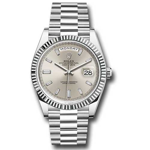Rolex 228236 sbdp Oyster Perpetual Day-Date Men's Watch. This elegant watch features a 40mm platinum case with a screw-down back and a screw-down crown that includes a Twinlock double waterproofness system for enhanced durability. The fluted bezel frames a scratch-resistant sapphire crystal, complete with a cyclops lens over the date, and showcases a striking silver dial, 10 baguette-cut diamond hour markers. Driven by the Rolex calibre 3255 perpetual self-winding movement, it offers central hour, minute, and seconds hands, as well as instantaneous day and date displays in apertures, unrestricted rapid-setting, and stop-seconds for precise timekeeping. With an approximate power reserve of 70 hours, this luxurious timepiece is complemented by a President bracelet featuring semi-circular three-piece links and a concealed folding Crownclasp buckle, while also maintaining waterproof capabilities of up to 100 meters (330 feet).
