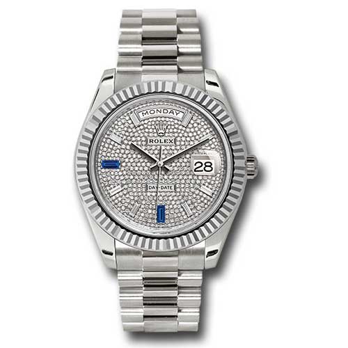 Rolex 228239 dp7d2sp Oyster Perpetual Day-Date Men's Watch. 40mm 18kt white gold case, screw-down back with Rolex fluting, screw-down crown with twinlock double waterproofness system, fluted bezel, scratch-resistant double anti-reflective sapphire crystal with cyclops lens over the date, diamond paved dial, 8 baguette-cut diamond hour markers and 2 baguette-cut sapphires, Rolex calibre 3255 automatic movement with centre hour, minute and seconds hands, instantaneous day and date in apertures, unrestricted rapid-setting, and stop-seconds for precise time setting, approximately 70 hours of power reserve, President bracelet with three-piece solid links comprised of a polished center link, satin-finished outer links, and ceramic inserts, concealed folding Crownclasp buckle. Waterproof to 100 meters.