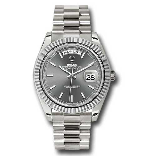 Rolex 228239 slip Oyster Perpetual Day-Date Men's Watch. 40mm 18kt white gold case, screw-down back with Rolex fluting, screw-down crown with twinlock double waterproofness system, 18K white gold fluted bezel, scratch-resistant double anti-reflective sapphire crystal with cyclops lens over the date, slate dial, index hour markers, Rolex calibre 3255 automatic movement with centre hour, minute and seconds hands, instantaneous day and date in apertures, unrestricted rapid-setting, and stop-seconds for precise time setting, approximately 70 hours of power reserve, President bracelet with three-piece solid links comprised of a polished center link, satin-finished outer links, and ceramic inserts, concealed folding Crownclasp buckle. Waterproof to 100 meters.
