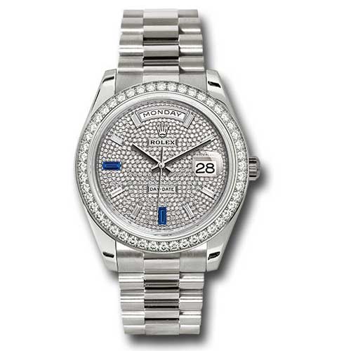 Rolex 228349RBR dp7d2sp Oyster Perpetual Day-Date Men's Watch. This exquisite watch boasts a 40mm 18K white gold case with a screw-down back featuring Rolex fluting and a screw-down crown equipped with a Twinlock double waterproofness system. The 18K white gold bezel is elegantly set with 48 diamonds, while a scratch-resistant double anti-reflective sapphire crystal with a cyclops lens protects the diamond-paved dial, adorned with 8 baguette-cut diamond hour markers and 2 baguette-cut sapphires. Powered by the Rolex calibre 3255 automatic movement, it includes central hour, minute, and seconds hands, instantaneous day and date displays in apertures, unrestricted rapid-setting, and stop-seconds for precise timekeeping. With an approximate 70 hours of power reserve, this luxurious timepiece features a President bracelet with three-piece solid links, a polished center link, satin-finished outer links, and ceramic inserts, along with a concealed folding Crownclasp buckle, and is waterproof up to 100 meters (330 feet).