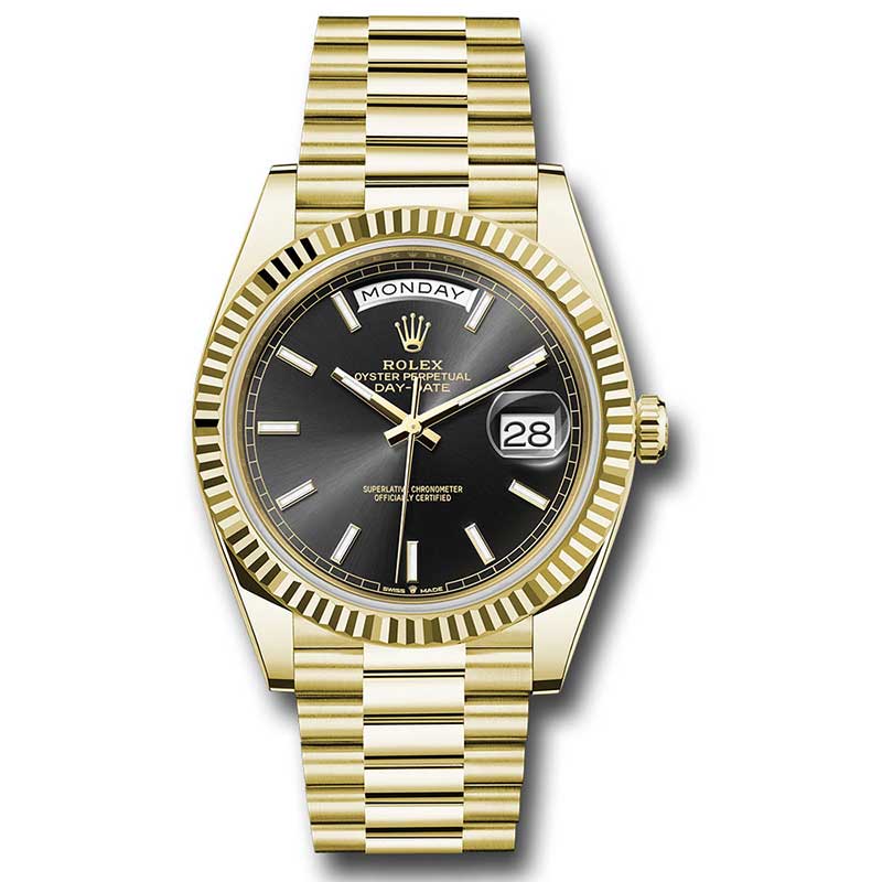 Rolex 228238 bkip Oyster Perpetual Day-Date 40 Men's Watch. 40mm 18K yellow gold case, screw-down back with Rolex fluting, screw-down crown with twinlock double waterproofness system, fluted bezel, scratch-resistant double anti-reflective sapphire crystal with cyclops lens over the date, black dial, index hour markers with Chromalight, Rolex calibre 3255 automatic movement with centre hour, minute and seconds hands, instantaneous day and date in apertures, unrestricted rapid-setting, and stop-seconds for precise time setting, approximately 70 hours of power reserve, President bracelet with three-piece solid links comprised of a polished center link, satin-finished outer links, and ceramic inserts, concealed folding Crownclasp buckle. Waterproof to 100 meters.