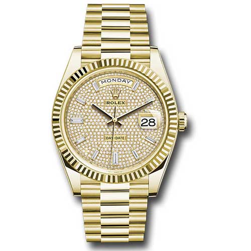 Rolex 228238 dpbdp Oyster Perpetual Day-Date 40 Men's Watch. 40mm 18K yellow gold case, screw-down back with Rolex fluting, screw-down crown with twinlock double waterproofness system, fluted bezel, scratch-resistant double anti-reflective sapphire crystal with cyclops lens over the date, diamond paved dial, 10 baguette-cut diamond hour markers, Rolex calibre 3255 automatic movement with centre hour, minute and seconds hands, instantaneous day and date in apertures, unrestricted rapid-setting, and stop-seconds for precise time setting, approximately 70 hours of power reserve, President bracelet with three-piece solid links comprised of a polished center link, satin-finished outer links, and ceramic inserts, concealed folding Crownclasp buckle. Waterproof to 100 meters.