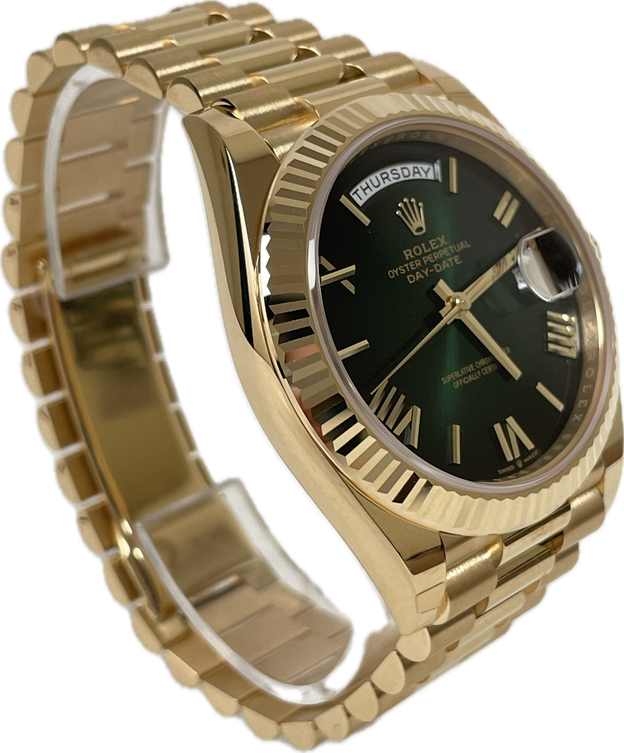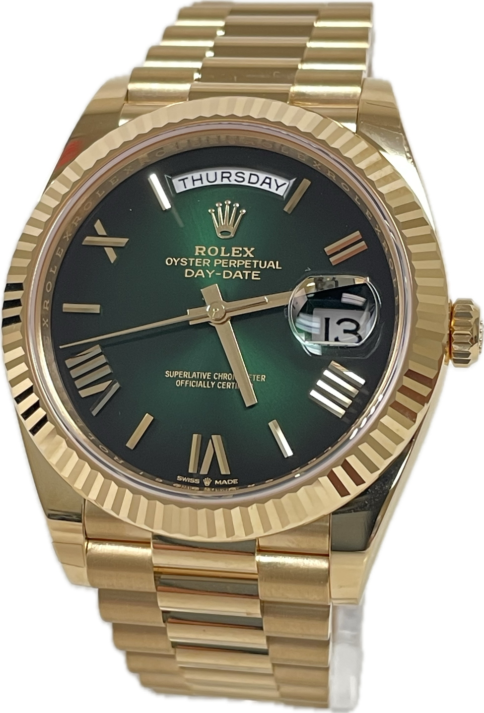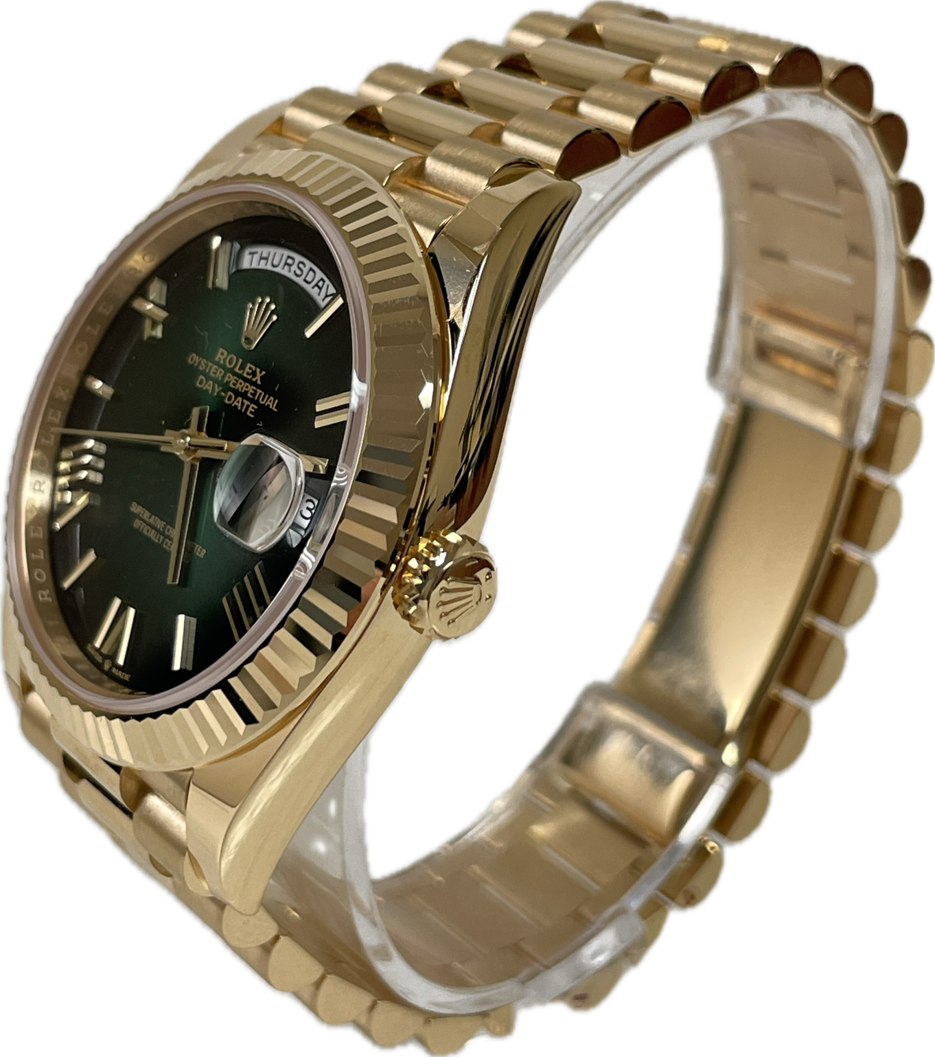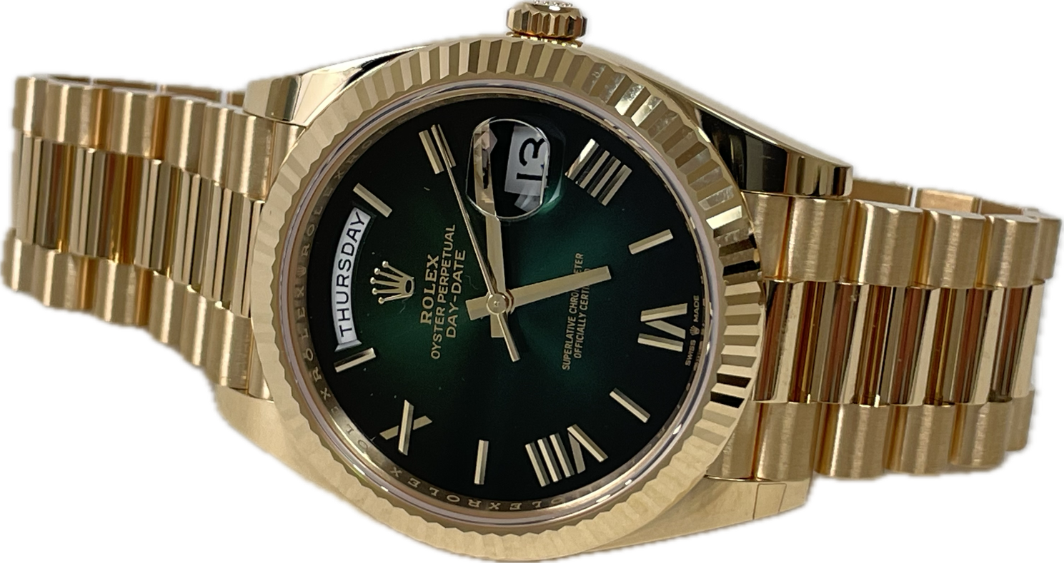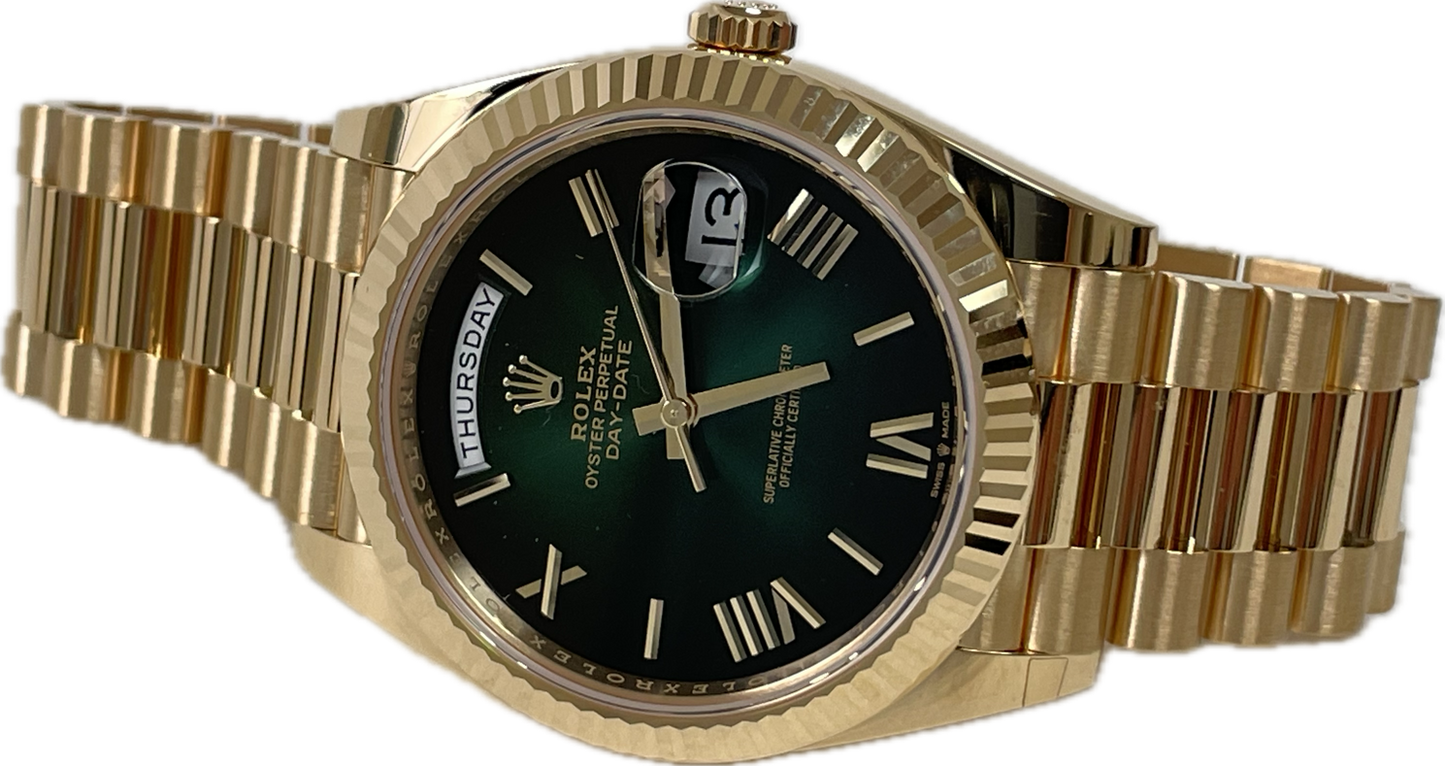 Rolex 228238 grobdrp Oyster Perpetual Day-Date 40 Men's Watch. 40mm 18K yellow gold case, screw-down back with Rolex fluting, screw-down crown with twinlock double waterproofness system, fluted bezel, scratch-resistant double anti-reflective sapphire crystal with cyclops lens over the date, green ombré dial, bevelled deconstructed Roman numerals, Rolex calibre 3255 automatic movement with centre hour, minute and seconds hands, instantaneous day and date in apertures, unrestricted rapid-setting, and stop-seconds for precise time setting, approximately 70 hours of power reserve, President bracelet with three-piece solid links comprised of a polished center link, satin-finished outer links, and ceramic inserts, concealed folding Crownclasp buckle. Waterproof to 100 meters
