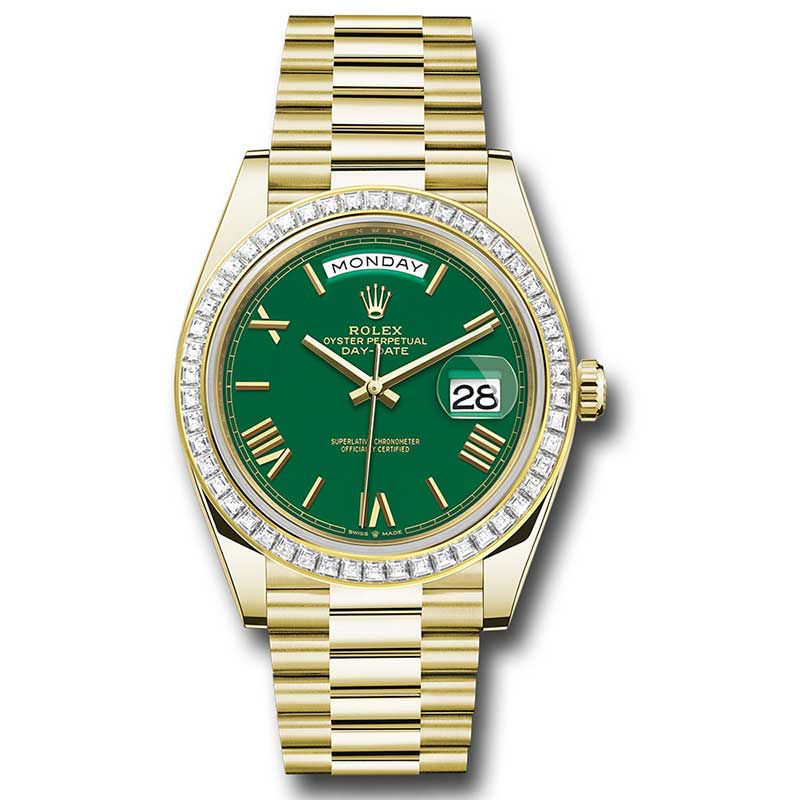 Rolex 228398tbr grrp Oyster Perpetual Day-Date Men's Watch. 40mm 18K yellow gold case, screw-down back with Rolex fluting, screw-down crown with twinlock double waterproofness system, bezel set with 50 baguette-cut diamonds, scratch-resistant double anti-reflective sapphire crystal with cyclops lens over the date, green dial, Roman numerals, Rolex calibre 3255 automatic movement with centre hour, minute and seconds hands, instantaneous day and date in apertures, unrestricted rapid-setting, and stop-seconds for precise time setting, approximately 70 hours of power reserve, President bracelet with three-piece solid links comprised of a polished center link, satin-finished outer links, and ceramic inserts, concealed folding Crownclasp buckle. Waterproof to 100 meters.
