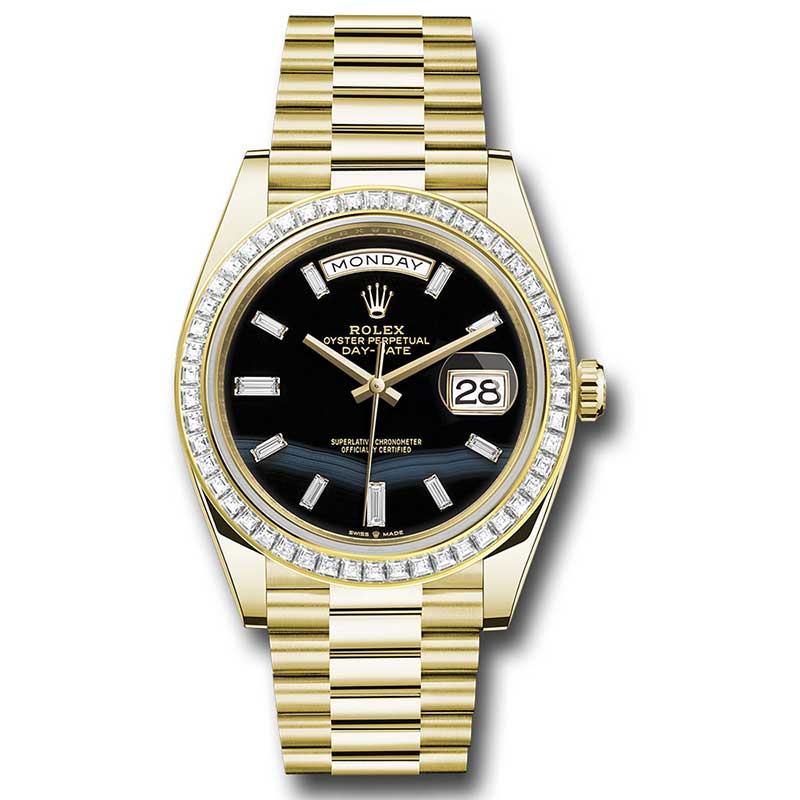 Rolex 228398tbr onbdp Oyster Perpetual Day-Date Men's Watch. 40mm 18K yellow gold case, screw-down back with Rolex fluting, screw-down crown with twinlock double waterproofness system, bezel set with 50 baguette-cut diamonds, scratch-resistant double anti-reflective sapphire crystal with cyclops lens over the date, onyx dial, 10 baguette-cut diamond hour markers, Rolex calibre 3255 automatic movement with centre hour, minute and seconds hands, instantaneous day and date in apertures, unrestricted rapid-setting, and stop-seconds for precise time setting, approximately 70 hours of power reserve, President bracelet with three-piece solid links comprised of a polished center link, satin-finished outer links, and ceramic inserts, concealed folding Crownclasp buckle. Waterproof to 100 meters.