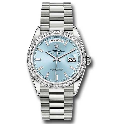 Rolex 128396tbr ibbdp Oyster Perpetual Day-Date Watch. This remarkable watch features a 36mm platinum case with a screw-down back and a twinlock double waterproofness system, complemented by a dazzling diamond bezel. The scratch-resistant sapphire crystal includes a cyclops lens over the ice blue dial, 10 baguette-cut dimaond hour markers. It is powered by the Rolex calibre 3255 perpetual self-winding movement, featuring centre hour, minute, and seconds hands, as well as instantaneous day and date in apertures, secure rapid-setting, and stop-seconds for precise time adjustments, with approximately 70 hours of power reserve. The President bracelet is made of semi-circular three-piece links and includes a concealed folding Crownclasp buckle, while the watch is waterproof up to 100 meters (330 feet).