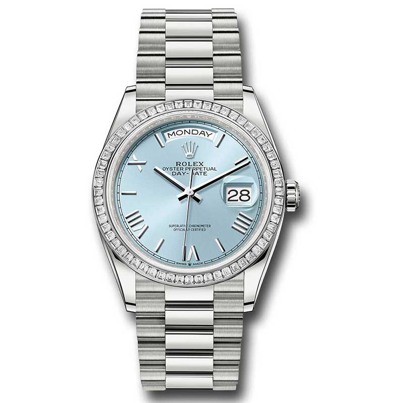 Rolex 128396tbr ibbdrp Oyster Perpetual Day-Date Watch. This remarkable watch features a 36mm platinum case with a screw-down back and a twinlock double waterproofness system, complemented by a dazzling diamond bezel. The scratch-resistant sapphire crystal includes a cyclops lens over the ice blue dial, bevelled deconstructed Roman numerals. It is powered by the Rolex calibre 3255 perpetual self-winding movement, featuring centre hour, minute, and seconds hands, as well as instantaneous day and date in apertures, secure rapid-setting, and stop-seconds for precise time adjustments, with approximately 70 hours of power reserve. The President bracelet is made of semi-circular three-piece links and includes a concealed folding Crownclasp buckle, while the watch is waterproof up to 100 meters (330 feet).