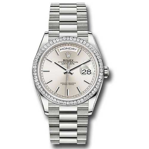 Rolex 128396tbr sip Oyster Perpetual Day-Date Watch. This remarkable watch features a 36mm platinum case with a screw-down back and a twinlock double waterproofness system, complemented by a dazzling diamond bezel. The scratch-resistant sapphire crystal includes a cyclops lens over the silver dial, index hour markers. It is powered by the Rolex calibre 3255 perpetual self-winding movement, featuring centre hour, minute, and seconds hands, as well as instantaneous day and date in apertures, secure rapid-setting, and stop-seconds for precise time adjustments, with approximately 70 hours of power reserve. The President bracelet is made of semi-circular three-piece links and includes a concealed folding Crownclasp buckle, while the watch is waterproof up to 100 meters (330 feet).