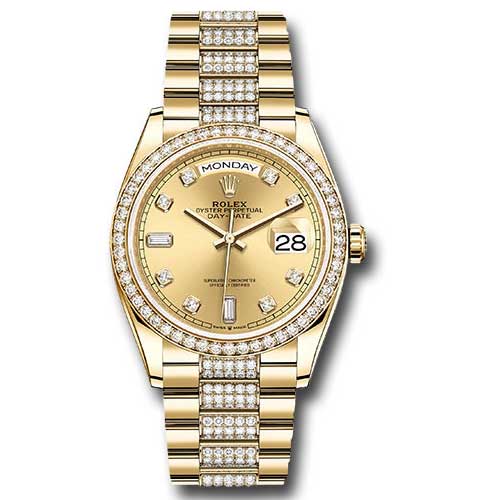 Rolex 128348rbr chddp stunning timepiece features a 36mm 18K yellow gold case with a screw-down back and a screw-down crown equipped with a twinlock double waterproofness system, complemented by a sparkling diamond bezel. It showcases a striking champagne dial adorned with diamond hour markers. Powered by the Rolex calibre 3255 perpetual self-winding movement, the watch includes centre hour, minute, and seconds hands, instantaneous day and date functions in apertures, unrestricted rapid-setting, and stop-seconds for precise time setting, with approximately 70 hours of power reserve. The luxurious diamond-set President bracelet features a concealed folding Crownclasp buckle and ensures the watch is waterproof to 100 meters (330 feet).
