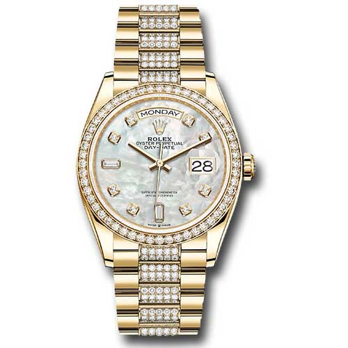 Rolex 128348rbr mddp stunning timepiece features a 36mm 18K yellow gold case with a screw-down back and a screw-down crown equipped with a twinlock double waterproofness system, complemented by a sparkling diamond bezel. It showcases a striking mother-of-pearl dial adorned with diamond hour markers. Powered by the Rolex calibre 3255 perpetual self-winding movement, the watch includes centre hour, minute, and seconds hands, instantaneous day and date functions in apertures, unrestricted rapid-setting, and stop-seconds for precise time setting, with approximately 70 hours of power reserve. The luxurious diamond-set President bracelet features a concealed folding Crownclasp buckle and ensures the watch is waterproof to 100 meters (330 feet).