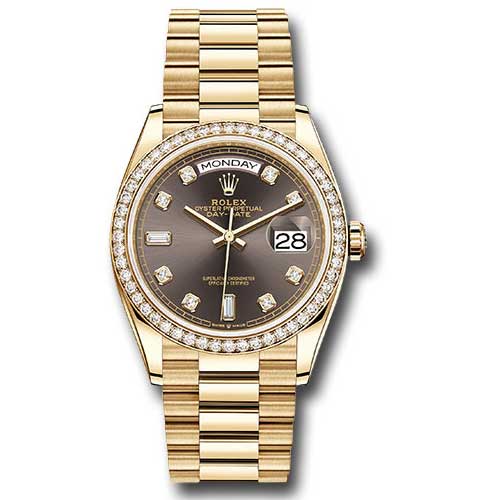 Rolex 128348RBR dkgdp 36mm 18K yellow gold case, screw-down back, screw-down crown with twinlock double waterproofness system, bezel set with 52 diamonds, scratch-resistant sapphire crystal with cyclops lens over the date, dark gray dial, diamond hour markers, Rolex calibre 3255 perpetual self-winding movement with centre hour, minute and seconds hands, instantaneous day and date in apertures, unrestricted rapid-setting, and stop-seconds for precise time setting, approximately 70 hours of power reserve, 18K yellow gold President bracelet with semi-circular three-piece links, concealed folding Crownclasp buckle.