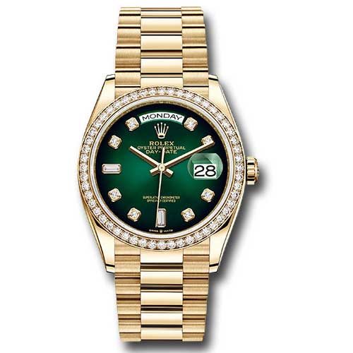 Rolex 128348RBR godp 36mm 18K yellow gold case, screw-down back, screw-down crown with twinlock double waterproofness system, bezel set with 52 diamonds, scratch-resistant sapphire crystal with cyclops lens over the date, green ombré dial, diamond hour markers, Rolex calibre 3255 perpetual self-winding movement with centre hour, minute and seconds hands, instantaneous day and date in apertures, unrestricted rapid-setting, and stop-seconds for precise time setting, approximately 70 hours of power reserve, 18K yellow gold President bracelet with semi-circular three-piece links, concealed folding Crownclasp buckle.