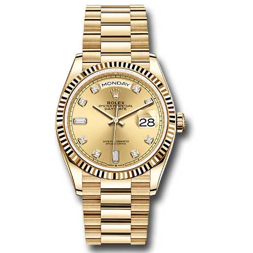 Rolex 128238 chdp 36mm 18K yellow gold case, screw-down back, screw-down crown with twinlock double waterproofness system, bezel set with 52 diamonds, scratch-resistant sapphire crystal with cyclops lens over the date, champagne dial, diamond hour markers, Rolex calibre 3255 perpetual self-winding movement with centre hour, minute and seconds hands, instantaneous day and date in apertures, unrestricted rapid-setting, and stop-seconds for precise time setting, approximately 70 hours of power reserve, 18K yellow gold President bracelet with semi-circular three-piece links, concealed folding Crownclasp buckle.