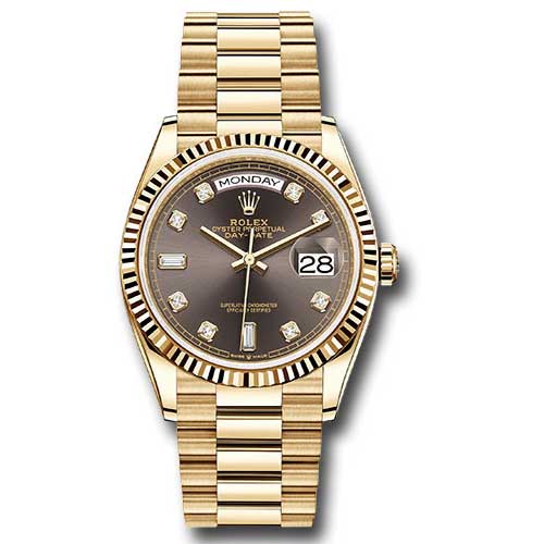 Rolex 128238 dkgdp 36mm 18K yellow gold case, screw-down back, screw-down crown with twinlock double waterproofness system, bezel set with 52 diamonds, scratch-resistant sapphire crystal with cyclops lens over the date, dark gray dial, diamond hour markers, Rolex calibre 3255 perpetual self-winding movement with centre hour, minute and seconds hands, instantaneous day and date in apertures, unrestricted rapid-setting, and stop-seconds for precise time setting, approximately 70 hours of power reserve, 18K yellow gold President bracelet with semi-circular three-piece links, concealed folding Crownclasp buckle.