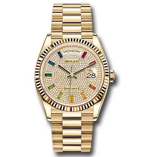 Rolex 128238 dprsp 36mm 18K yellow gold case, screw-down back, screw-down crown with twinlock double waterproofness system, bezel set with 52 diamonds, scratch-resistant sapphire crystal with cyclops lens over the date, diamond paved dial, rainbow-colored sapphire hour markers, Rolex calibre 3255 perpetual self-winding movement with centre hour, minute and seconds hands, instantaneous day and date in apertures, unrestricted rapid-setting, and stop-seconds for precise time setting, approximately 70 hours of power reserve, 18K yellow gold President bracelet with semi-circular three-piece links, concealed folding Crownclasp buckle.