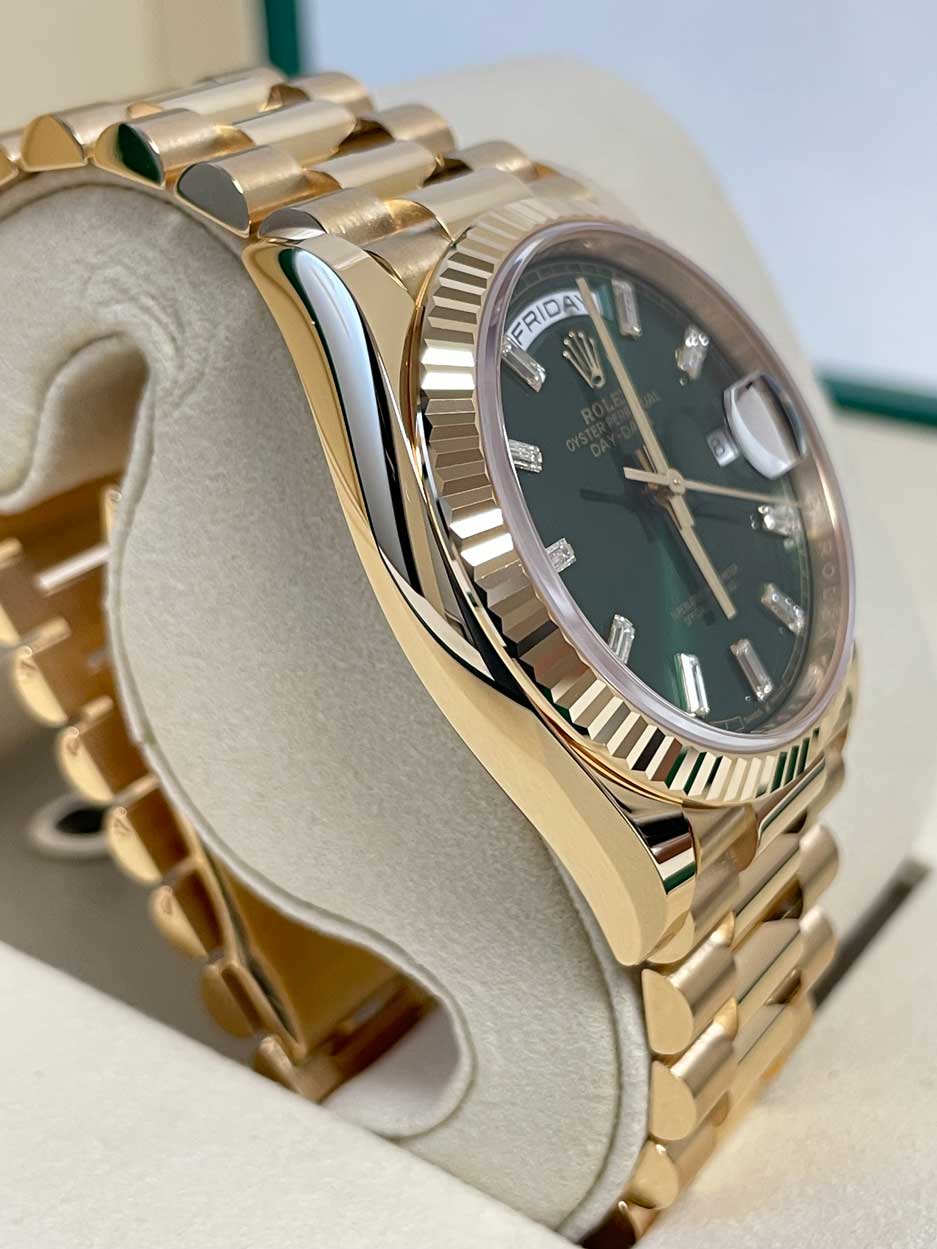 Rolex 128238 grbdp 36mm 18K yellow gold case, screw-down back, screw-down crown with twinlock double waterproofness system, bezel set with 52 diamonds, scratch-resistant sapphire crystal with cyclops lens over the date, green dial, 10 baguette-cut hour markers, Rolex calibre 3255 perpetual self-winding movement with centre hour, minute and seconds hands, instantaneous day and date in apertures, unrestricted rapid-setting, and stop-seconds for precise time setting, approximately 70 hours of power reserve, 18K yellow gold President bracelet with semi-circular three-piece links, concealed folding Crownclasp buckle.