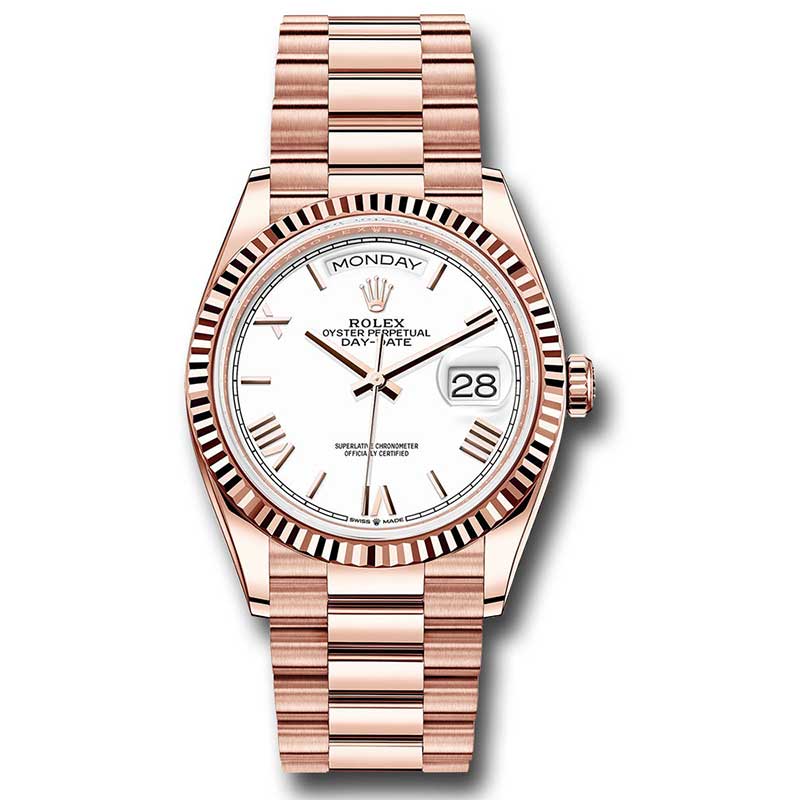 Rolex 128235 wbdrp Men's Day-Date Watch. This exquisite watch features a 36mm 18K Everose gold case with a screw-down back and crown, incorporating a twinlock double waterproofness system and a fluted bezel. It boasts a scratch-resistant sapphire crystal with a cyclops lens over the white dial, bevelled deconstructed Roman numerals. Powered by the Rolex calibre 3255 perpetual self-winding movement, it offers centre hour, minute, and seconds hands, instantaneous day and date functions in apertures, unrestricted rapid-setting, and stop-seconds for accurate time adjustments, along with approximately 70 hours of power reserve. The President bracelet features semi-circular three-piece links and a concealed folding Crownclasp buckle, while the watch is waterproof up to 100 meters (330 feet).