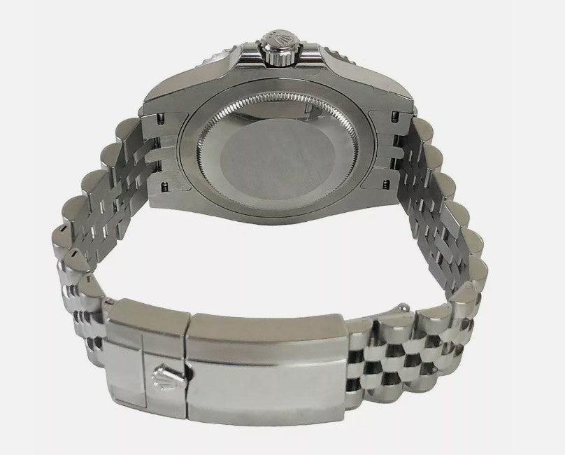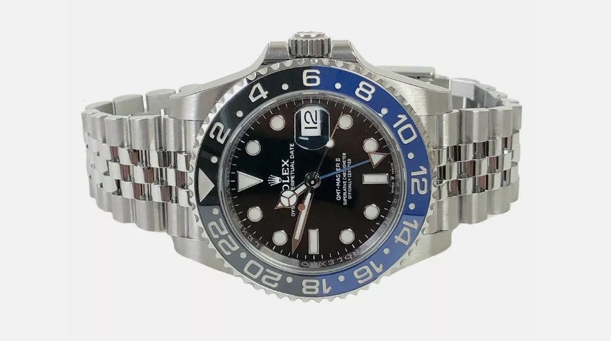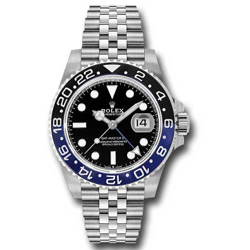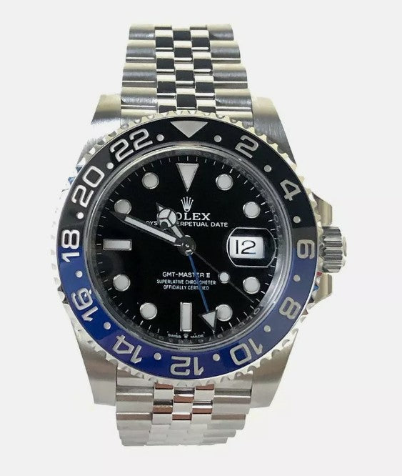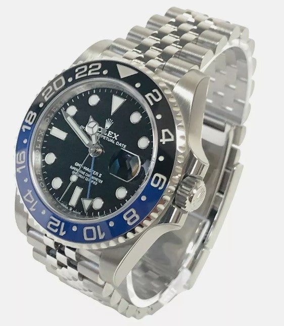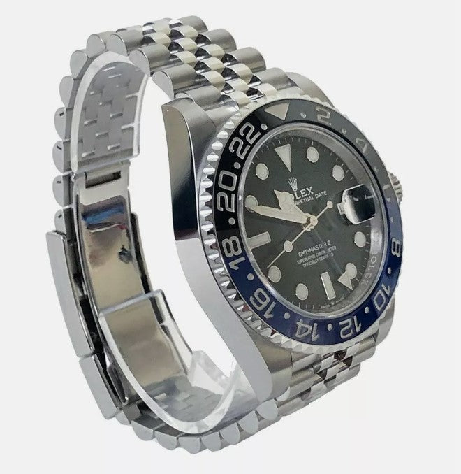 Rolex 126710BLNR j Men's Watch. This remarkable watch features a robust 40mm stainless steel case constructed with an Oystersteel monobloc middle case, ensuring durability and a sleek appearance. The timepiece is equipped with a screw-down crown and a bidirectional rotatable 24-hour graduated bezel, which is accented by a striking black and blue Cerachrom insert with engraved numerals, allowing for easy tracking of dual time zones. The watch is protected by a scratch-resistant sapphire crystal, complete with a cyclops lens positioned over the date for enhanced readability. The black dial showcases hour markers set with Chromalight, providing excellent legibility in various lighting conditions. At its heart lies the Rolex calibre 3285 self-winding movement, featuring a second time-zone hour hand and an instantaneous date function. With an impressive power reserve of approximately 70 hours, this timepiece is ideal for both everyday wear and travel. It is mounted on a stainless steel Jubilee bracelet, characterized by rounded five-piece links, and features a folding Oysterlock buckle with an Easylink 5mm comfort extension link for optimal fit. Additionally, it offers a waterproof rating of up to 100 meters, making it both stylish and functional for any adventure.