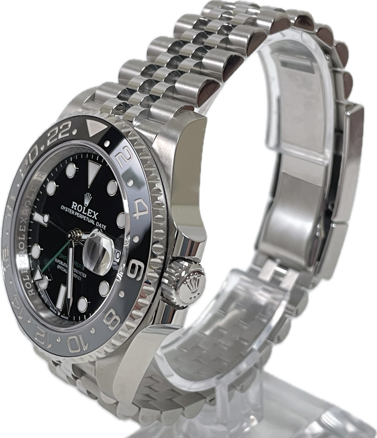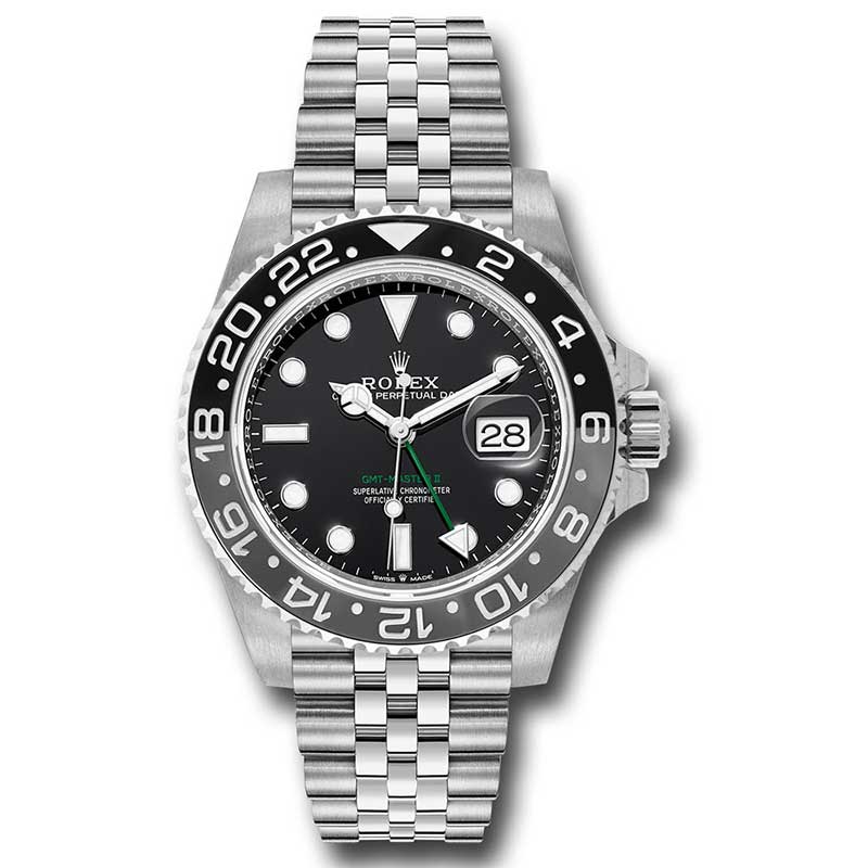 Rolex GMT Master II 126710grnr J Mens Watch. This remarkable watch features a robust 40mm Oystersteel case, complemented by a screw-down back and a screw-down crown that incorporates the Triplock triple waterproofness system, ensuring exceptional water resistance. The timepiece is designed with a bidirectional rotatable 24-hour graduated bezel, featuring a two-color grey and black Cerachrom insert in ceramic along with molded numerals and graduations for clarity and functionality. It is protected by a scratch-resistant sapphire crystal and boasts a sleek black dial that enhances its sophisticated appearance. At its heart is the Rolex calibre 3285 movement, which includes central hour, minute, and seconds hands, a 24-hour display, a second time zone with independent rapid-setting of the hour hand, and an instantaneous date feature, along with stop-seconds for precise time setting. With approximately 70 hours of power reserve, this watch is engineered for convenience and reliability. The Jubilee bracelet, characterized by five-piece links, is secured with a folding Oysterlock safety buckle that features an Easylink 5mm comfort extension link for adjustable fit. Additionally, the watch is waterproof to a depth of 100 meters (330 feet), making it a perfect combination of luxury and practicality for any adventure.