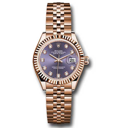 Rolex 279175 adj 18kt Rose Gold Lady Datejust 28mm Watch with Fluted Bezel. 28mm 18K Everose gold oyster case, screw-down crown with twinlock double waterproofness system, fluted bezel, scratch-resistant sapphire crystal with cyclops lens over the date and double anti-reflective coating, aubergine dial, diamond hour markers, Rolex calibre 2236 automatic movement with center hour, minute and seconds hands, instantaneous date with rapid setting, and stop-seconds for precise time setting, 18K Everose gold Jubilee bracelet with five-piece links, concealed folding Crownclasp buckle. Waterproof to 100 meters.