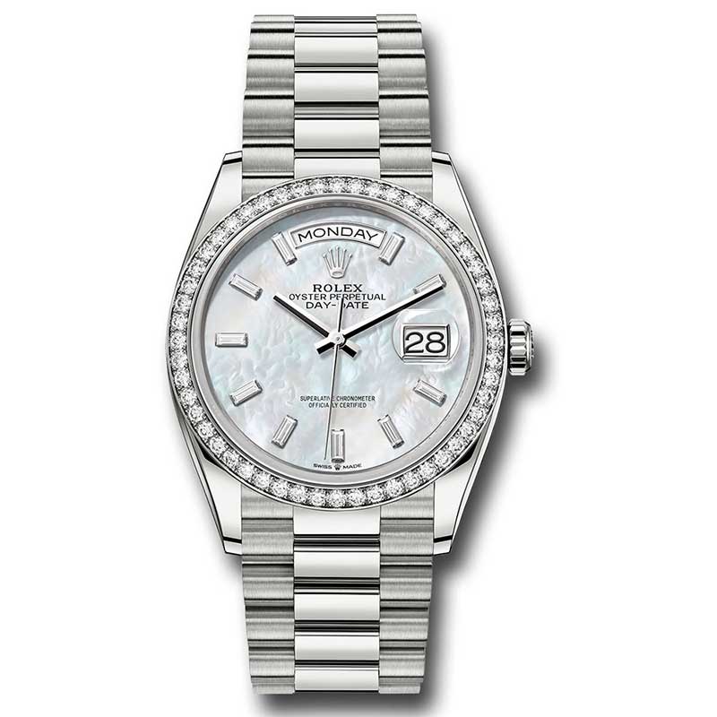 Rolex 128349rbr mbdp This stunning watch features a 36mm 18K white gold case with a screw-down back and crown, equipped with a twinlock double waterproofness system and a diamond bezel. The scratch-resistant sapphire crystal includes a cyclops lens over the mother-of-pearl dial, which is enhanced by 10 baguette-cut diamond hour markers. Powered by the Rolex calibre 3255 perpetual self-winding movement, it boasts centre hour, minute, and seconds hands, instantaneous day and date functions in apertures, secure rapid-setting, and stop-seconds for precise time setting, along with an approximate 70-hour power reserve. Completed with a President bracelet of semi-circular three-piece links and a concealed folding Crownclasp buckle, the watch is waterproof up to 100 meters (330 feet).