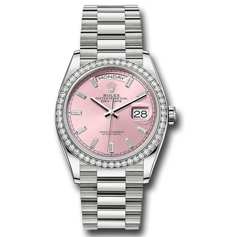 Rolex 128349rbr pbdp This stunning watch features a 36mm 18K white gold case with a screw-down back and crown, equipped with a twinlock double waterproofness system and a diamond bezel. The scratch-resistant sapphire crystal includes a cyclops lens over the pink dial, which is enhanced by 10 baguette-cut diamond hour markers. Powered by the Rolex calibre 3255 perpetual self-winding movement, it boasts centre hour, minute, and seconds hands, instantaneous day and date functions in apertures, secure rapid-setting, and stop-seconds for precise time setting, along with an approximate 70-hour power reserve. Completed with a President bracelet of semi-circular three-piece links and a concealed folding Crownclasp buckle, the watch is waterproof up to 100 meters (330 feet).