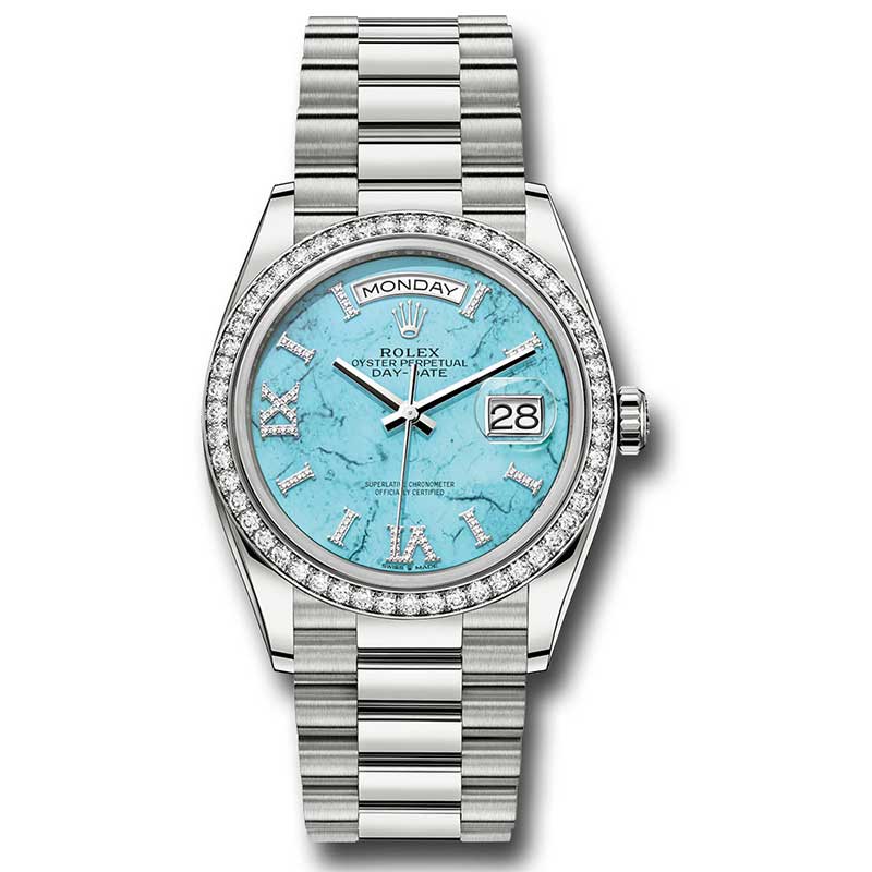 Rolex 128349rbr tdidrp. This luxurious watch features a 36mm 18K white gold case with a screw-down back and crown that utilizes a twinlock double waterproofness system, enhanced by a dazzling diamond bezel. The scratch-resistant sapphire crystal has a cyclops lens over the vibrant turquoise dial, which showcases diamond-set index hour markers along with Roman numeral markers at 6 and 9, adorned with a total of 56 diamonds. It is powered by the Rolex calibre 3255 perpetual self-winding movement, offering centre hour, minute, and seconds hands, instantaneous day and date functions in apertures, unrestricted rapid-setting, and stop-seconds for precise time setting, with approximately 70 hours of power reserve. Completed with a President bracelet featuring semi-circular three-piece links and a concealed folding Crownclasp buckle, the watch is waterproof up to 100 meters (330 feet).