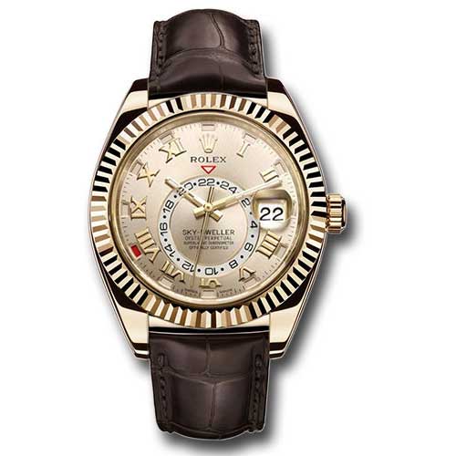 Rolex 326138 s Oyster Perpetual Sky-Dweller Watch. This watch features a 42mm 18K yellow gold case with a screw-down back and crown, complemented by a fluted bezel with a bidirectional rotatable Rolex Ring Command. It has a scratch-resistant sapphire crystal with a cyclops lens over the silver sunray dial, which displays Roman numerals. Powered by the Rolex calibre 9001 automatic movement, it offers a second time zone via an off-center rotating disc and a Saros annual calendar with a date at 3 o'clock and a month indicated by discrete apertures. The brown leather strap is secured with a folding Oysterclasp buckle, and the watch is waterproof up to 100 meters.