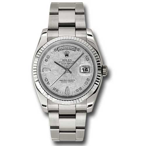 Rolex 118239 mtado 36mm 18K white gold case, screw-down back, screw-down crown with twinlock double waterproofness system, fluted bezel, scratch-resistant sapphire crystal with cyclops lens over the date, meteorite dial, 2 diamond hour markers and Arabic numerals, Rolex calibre 3255 perpetual self-winding movement with centre hour, minute and seconds hands, instantaneous day and date in apertures, unrestricted rapid-setting, and stop-seconds for precise time setting, approximately 70 hours of power reserve, 18K white gold Oyster bracelet with semi-circular three-piece links, concealed folding Crownclasp buckle.