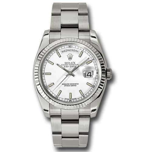 Rolex 118239 wso 36mm 18K white gold case, screw-down back, screw-down crown with twinlock double waterproofness system, fluted bezel, scratch-resistant sapphire crystal with cyclops lens over the date, white dial, index hour markers, Rolex calibre 3255 perpetual self-winding movement with centre hour, minute and seconds hands, instantaneous day and date in apertures, unrestricted rapid-setting, and stop-seconds for precise time setting, approximately 70 hours of power reserve, 18K white gold Oyster bracelet with semi-circular three-piece links, concealed folding Crownclasp buckle.
