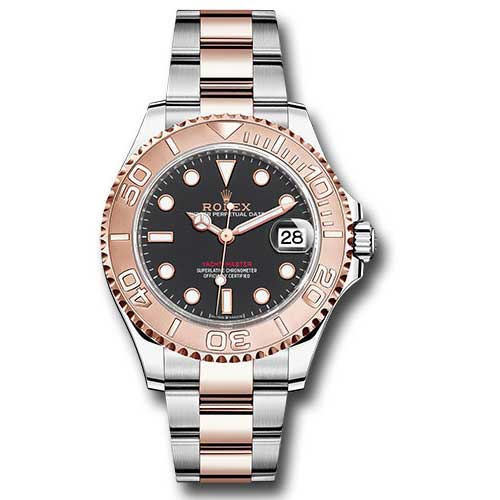 Rolex 268621 bko Yacht-Master Steel & Everose Gold Mens Watch. This stunning watch features a 37mm Everose Rolesor case composed of a robust 904L steel monobloc middle case with a screw-down back and a screw-down crown that incorporates a Triplock triple waterproofness system. The elegant 18K Everose gold bidirectional rotatable bezel is marked with raised polished 60-minute graduations and numerals, perfectly complementing the intense black dial adorned with Chromalight hour markers. Powered by the Rolex calibre 2236 automatic movement, the watch offers central hour, minute, and seconds hands, rapid-setting instantaneous date, and a stop-seconds function for precise timekeeping, with approximately 55 hours of power reserve. Additionally, it features a stainless steel and 18K Everose gold Oyster bracelet with flat three-piece links, a folding Oysterlock buckle, and an Easylink 5mm comfort extension link, while ensuring waterproof capabilities up to 100 meters.