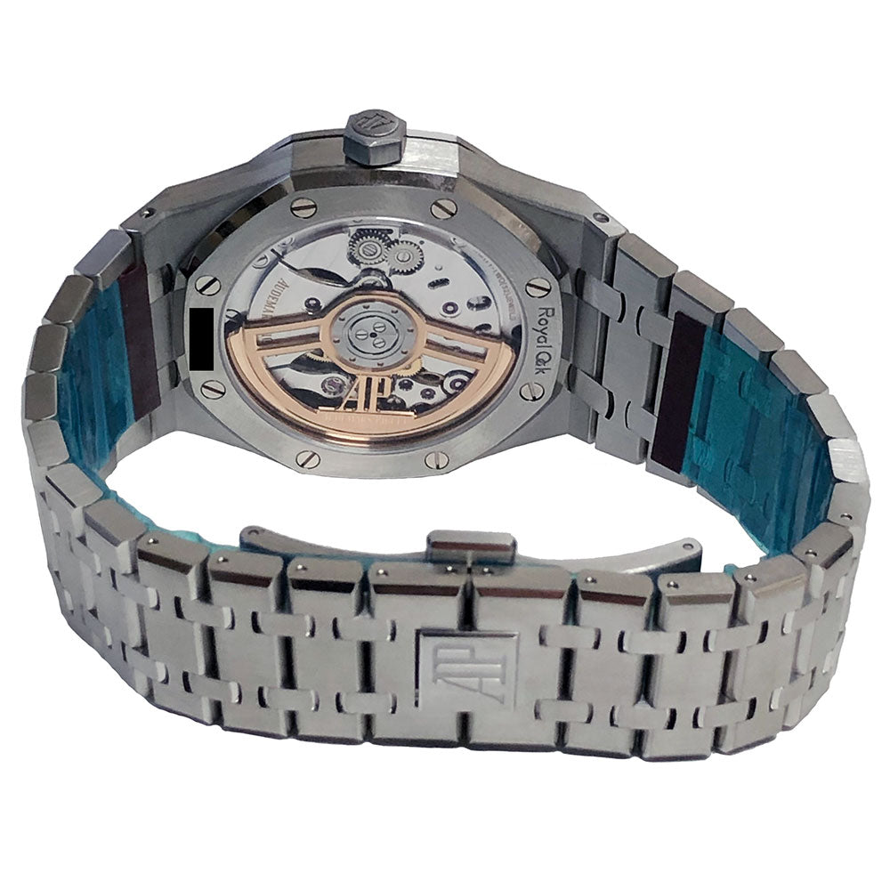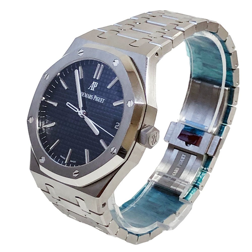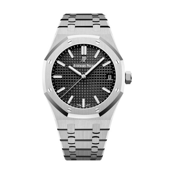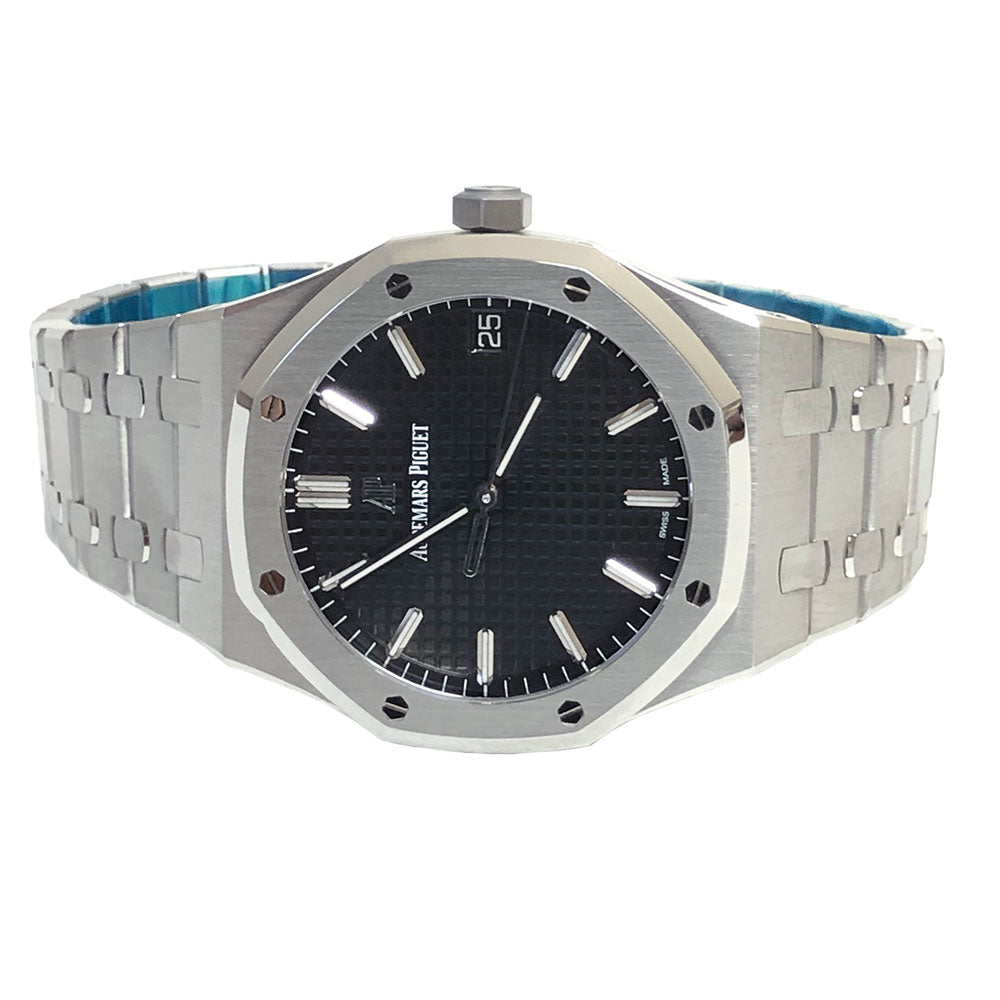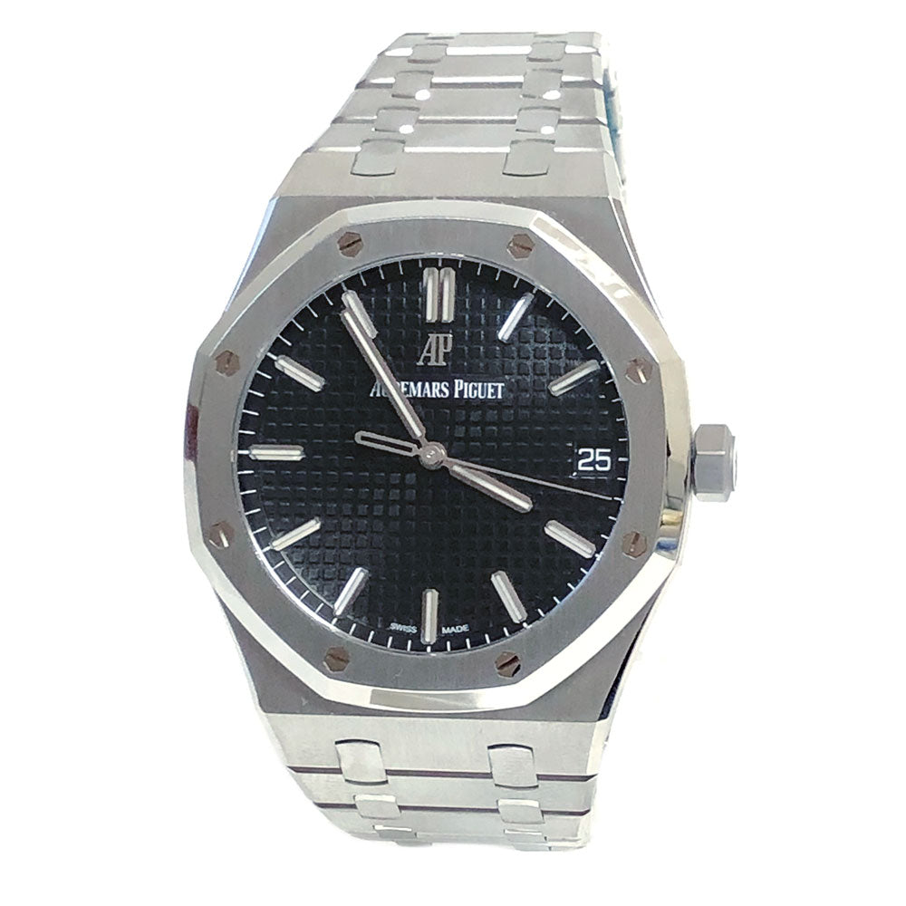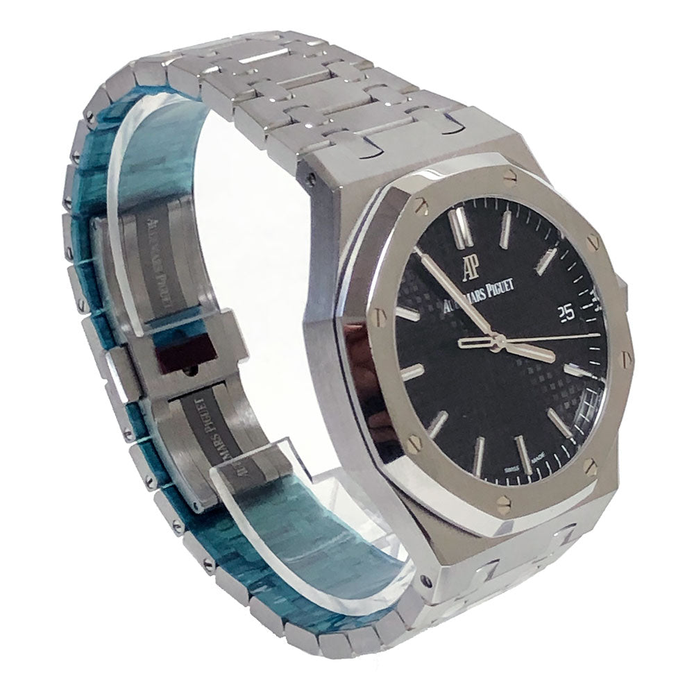 Audemars Piguet 15500st.oo.1220st.03 Royal Oak Automatic 41mm Mens Watch. Brushed finished stainless steel case with polished beveled corners. Brushed & polished octagon shaped fixed bezel, secured by 8 polished hex-head screws. Black dial with the Grande Tapisserie design pattern. Polished white gold hands, the hour & minute hands with luminous fill. Applied polished white gold index hour markers with luminous fill. Fine printed minute.seconds track on the dial flange. Date window at 3 o'clock. Audemars Piguet in-house caliber 4302, beats at 28,800 vph (4Hz), contains 32 jewels & has an approximate power reserve of 70 hours.