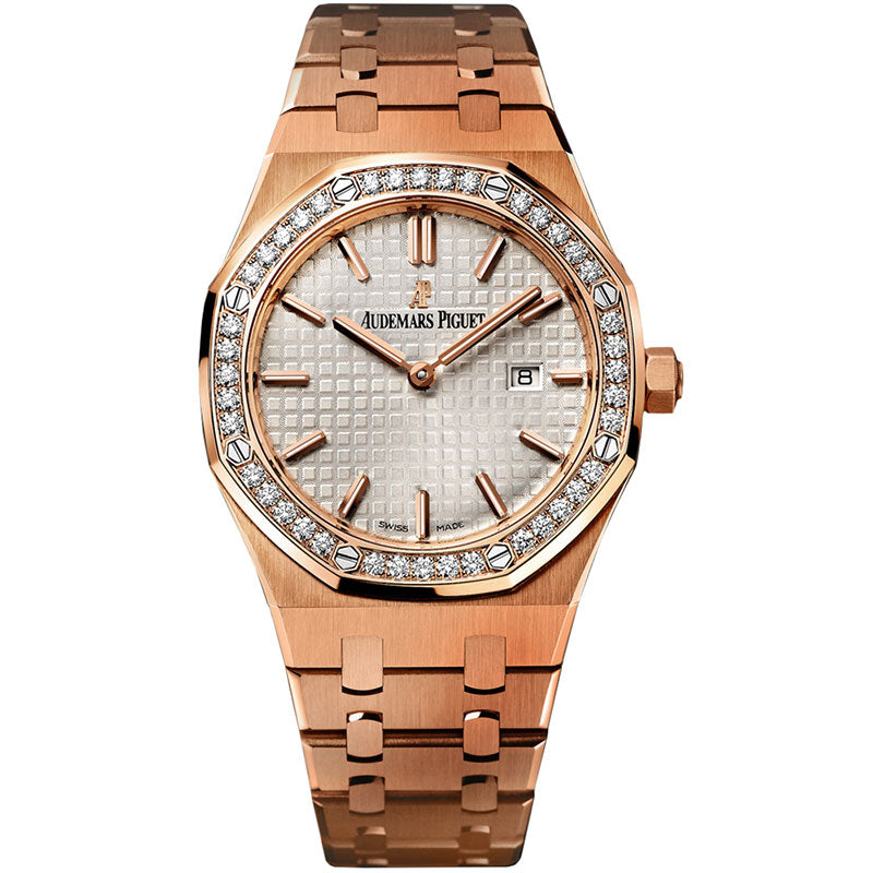 Audemars Piguet Royal Oak Silver Dial 18kt Rose Gold Ladies Watch 67651ORZZ1261OR01. 18kt rose gold case with a 18kt rose gold bracelet. Fixed bezel. Silver dial with gold-toned hands and index hour markers. Quartz movement. Scratch resistant sapphire crystal. Case size: 33 mm x 42 mm. Case thickness: 7 mm. Round case shape. Deployment clasp. Water resistant at 50 meters / 165 feet. Functions: date, hour, minute, second. Item Variations: 67651OR ZZ 1261OR 01, 67651OR-ZZ-1261OR-01, 67651ORZZ1261OR01.