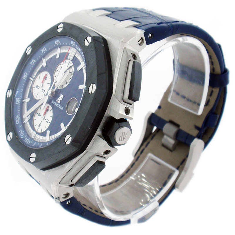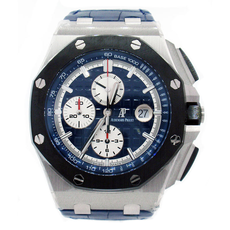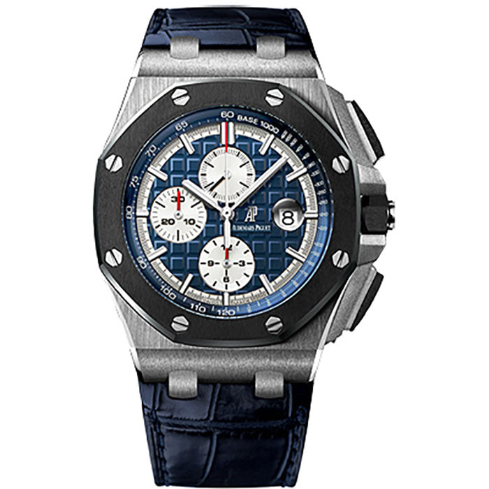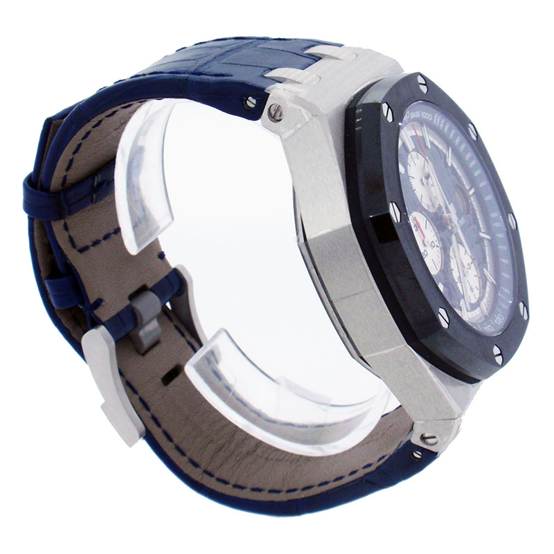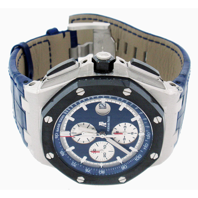 Audemars Piguet Royal Oak Offshore Blue Alligator Leather Mens Watch 26401PO.OO.A018CR.01. 950 platinum case with a blue alligator leather strap. Fixed bezel. Blue dial with silver-toned hands and index hour markers. Tachymeter scale appears around the outer rim. Automatic movement. Scratch resistant sapphire crystal. Case diameter: 44 mm. Case thickness: 14.45 mm. Round case shape. Tang clasp. Water resistant at 100 meters / 330 feet. Functions: chronograph, date, hour, minute, second.